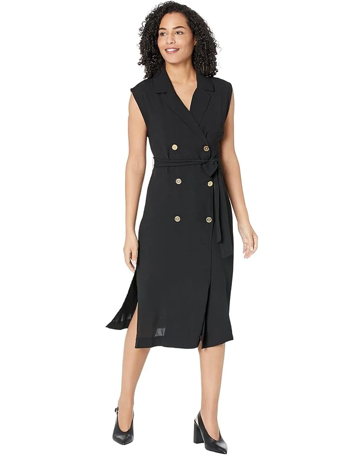 SKU: #9831494Notched collar with V-neckline and sleeveless design.Double-breasted buttoned front closure. Belt loops and self-tie belt on the waist. Midi-length dress. Straight hemline with side slit. Intended to hit below the knee.