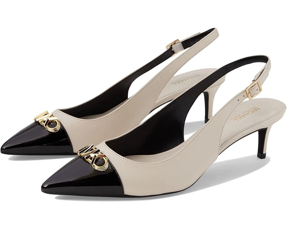 Add subtle elegance to your ensemble without impinging on your comfort needs by wearing the MICHAEL Michael Kors® Parker Flex Kitten Sling Heels.SKU: #9821837Leather and synthetic upper and lining.Buckle closure on the slingback strap.Contrasting pointed toe with goldtone metallic logo accent.Kitten heel construction.Rubber outsole.Imported.Product measurements were taken using size 9, width M. Please note that measurements may vary by size.Weight of footwear is based on a single item, not a pair.Measurements:
